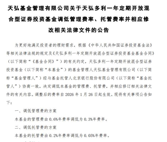 在此之前,天弘基金已于2026年1月21日起将天弘宁弘六个月持有期混合型证券投资基金的管理费、托管费的年费率分别由0.7%、0.15%调降至0.3%、0.05%。